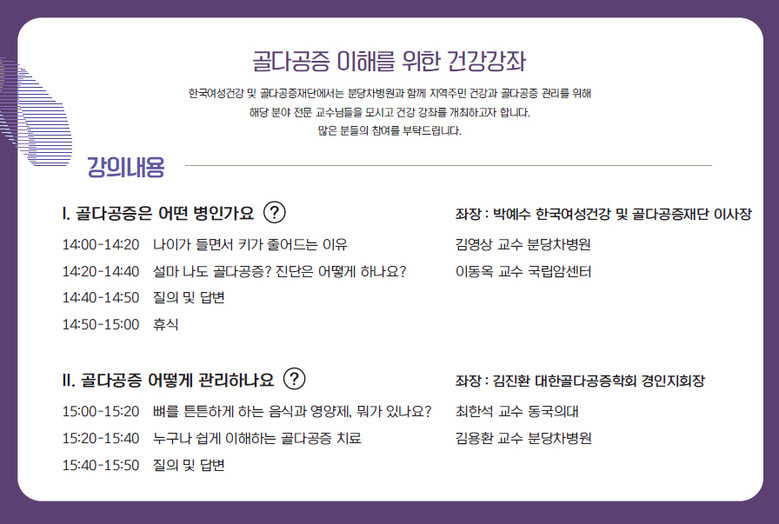 이번 강좌는 ▲나이가 들면서 키가 줄어드는 이유(분당 차병원 가정의학과 김영상 교수) ▲설마 나도 골다공증? 진단은 어떻게 하나요?(국립암센터 산부인과 이동옥 교수) ▲뼈를 튼튼하게 하는 음식과 영양제, 뭐가 있나요?(동국대학교 일산병원 내분비내과 최한석 교수) ▲누구나 쉽게 이해하는 골다공증 치료(분당 차병원 가정의학과 김용환 교수)▲질의 응답의 순서로 진행될 예정이다.
