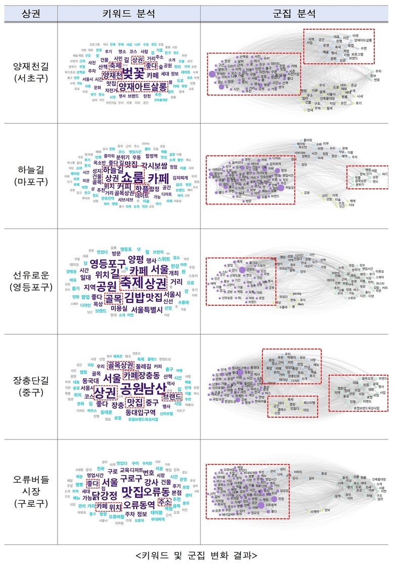 먼저 상권의 정체성 확립에 따른 이미지 개선 효과가 뚜렷하게 나타났다. 텍스트 마이닝 기법으로 온라인(네이버, 다음, 구글) 반응을 분석한 결과, 5개 상권 모두에서 고유 브랜드 요소와 장소성이 강화된 것으로 나타났다. 특히 브랜딩, 핫플, 강화된 체험, 이벤트, 앵커스토어 등 로컬브랜드를 상징하는 키워드가 새롭게 부각되며, 각 상권의 새로운 얼굴이 형성되고 있음을 확인했다.