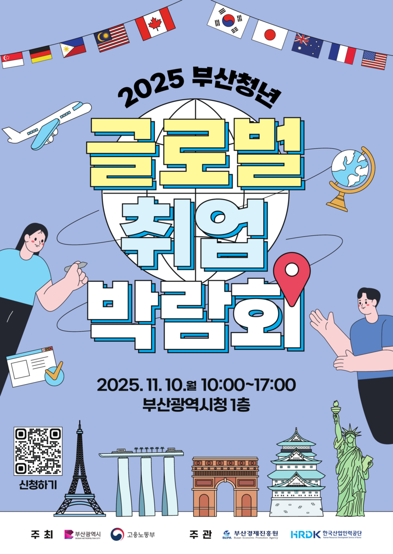 ◈ 해외 취업에 관심 있는 사람이면 누구나 부산일자리정보망 또는 월드잡플러스 누리집에서 사전 예약하거나 현장 접수를 통해 참여할 수 있어 [부산 세계타임즈=이용우 기자] 부산시(시장 박형준)는 오늘(10일) 오전 10시 시청 1층 대회의실과 대강당 일원에서 「2025 부산청년 글로벌 취업박람회」를 개최한다고 밝혔다.