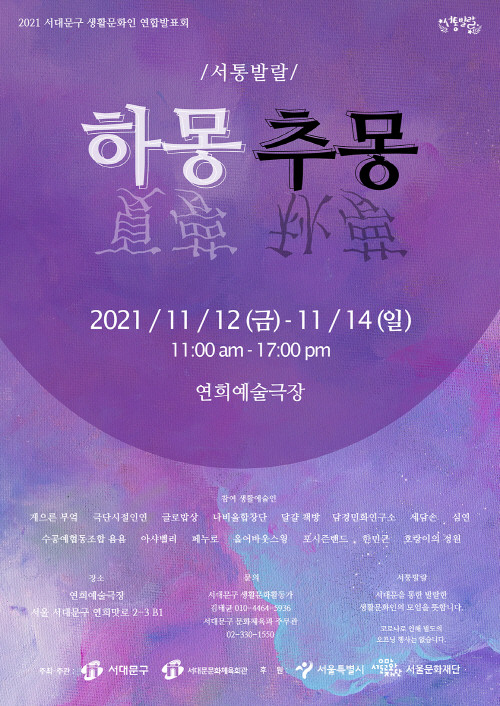 이번 서통발랄 하몽추몽 전시에는 ▲게으른 부엌 ▲극단시절인연 ▲글로밥상 ▲나비울합창단, 달걀책방 ▲담경민화연구소 ▲세담손 ▲심연 ▲수공예협동조합 욤욤 ▲아샤벨리 ▲페누로 ▲올어바웃스윙 ▲포시즌밴드 ▲한민근 ▲호랑이의 정원 등의 문화예술팀이 참여한다.