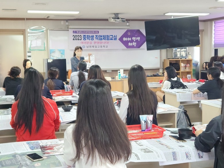 [남원 세계타임즈 = 이채봉 기자] 성원학원 남원제일고등학교(학교장 김한태)는 중학교 3학년 학생을 대상으로 직업의식을 함양하고 특성화고의 다양한 전공을 체험할수 있는‘2023 학과체험’을 10일날 개최하였다. 이번행사에는 관내 중학교 3학년 학생과 담임교사, 학부모 등 70여명이 넘게 참가하였으며, 즐겁고 유익한 진로 탐색활동과 직접 체험하는 시간을 가졌다.