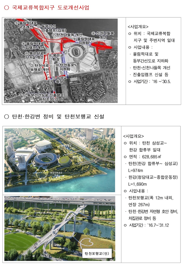 도로개선사업은 주요 고속화 도로(올림픽대로, 동부간선도로 등) 간 직결에 따른 통과교통 배제, 탄천‧신천 나들목 진출입 개선 등을 통해 삼성역 일대 교통체증을 개선하기 위한 목적으로 시행되며, 올림픽대로 지하화 등 보행중심의 환경개선도 함께 이뤄진다.