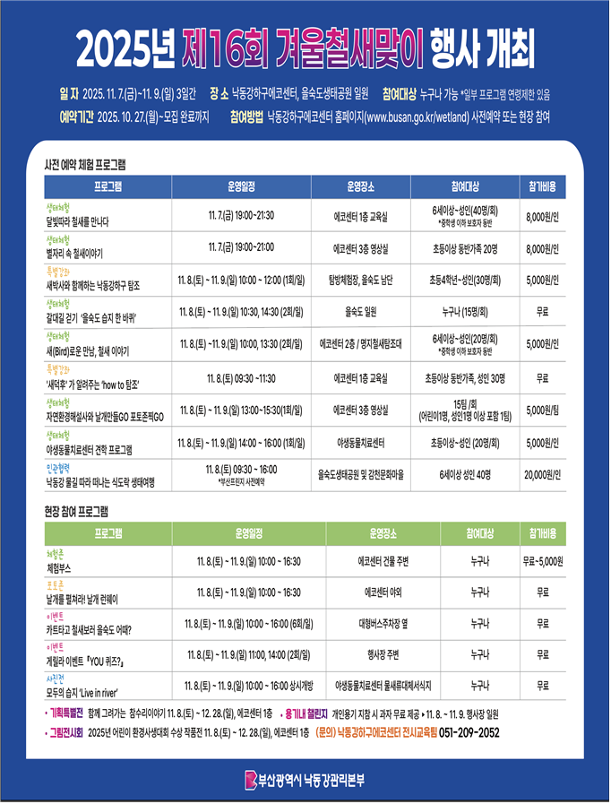 <제16회 겨울철새맞이 행사 개요> ❍ 기 간 : 2025. 11. 7.(금) ~ 11. 9.(일) [3일간] ❍ 장 소 : 을숙도생태공원 ❍ 주 최 : 낙동강관리본부 낙동강하구에코센터 ❍ 참여대상 : 누구나 가능 ❍ 참여방법 : 누리집 사전 예약 또는 현장접수 |