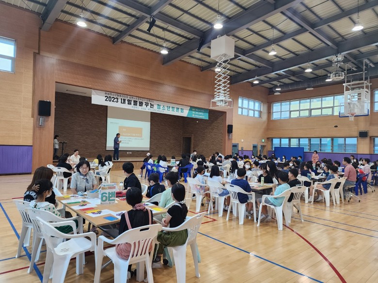 토론활동은 7월 12일(수), 학교 체육관에서 5학년 전체(114명)가 모여 원탁토론회로 진행되었다. 총괄촉진자, 진행, 테이블촉진자 등으로 외부 전문가를 구성하여 ▷청소년 지역 참여로 변화 사례 소개 ▷우리 동네 마을 자원 탐색하기 ▷청소년 정책 제안(내가 시장이라면) 하기 등의 과정을 거치는 동안 토론 분위기는 무르익었으며 학생들의 열기가 점점 뜨거워졌다. 100분 토론 시간이 짧을 정도였다.