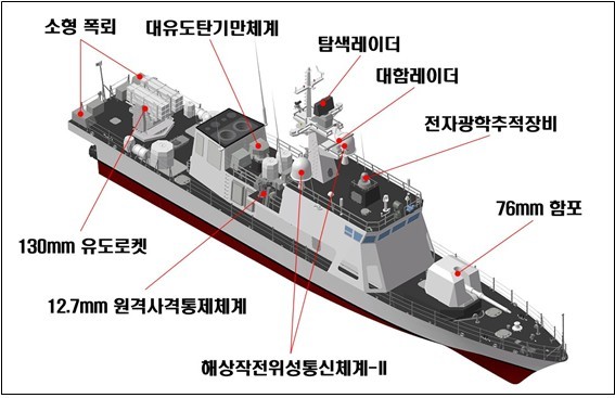 신형 고속정은 130mm 유도로켓, 탐색레이더, 전자광학추적장치 및 76mm 함포를 탑재해 기존 150t급 고속정(참수리·PKM)보다 전투능력이 강화됐다.