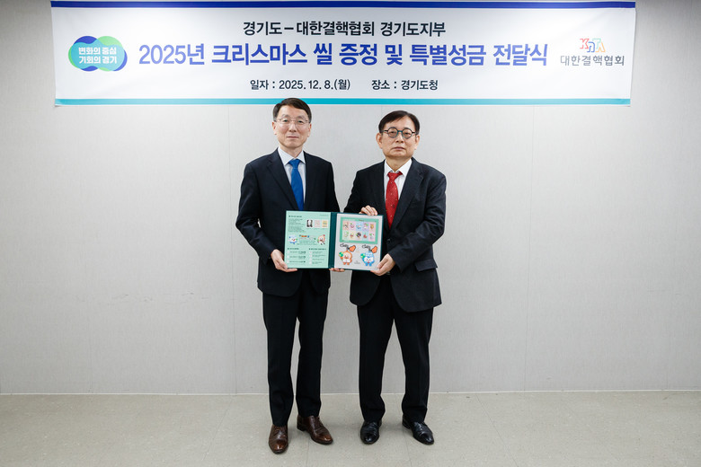 [경기도 세계타임즈=송민수 기자] 김성중 경기도 행정1부지사는 8일 도청에서 김영준 대한결핵협회 경기도지부장으로부터 크리스마스 실(seal)을 증정받고 특별성금 200만 원을 전달했다. 전달식은 2025년 크리스마스 실 모금 캠페인의 취지를 함께하고 결핵퇴치기금을 마련하기 위해 이뤄졌다.