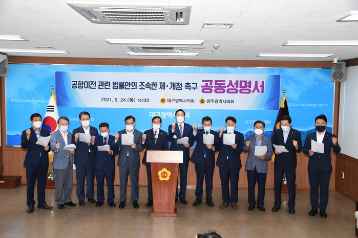 이번 성명서는 그간 광주시와 대구시가 군공항을 겸하는 기존 민간 공항을 타 지역으로 확장 이전하는 사업추진 일환으로 「군공항이전 특별법 개정」, 「대구경북신공항 특별법 제정」을 촉구하였지만, 지난 2월 임시국회에서 상임위원회 문턱조차 넘지 못하는 등 여전히 지지부진한 상황에서 타개책을 마련하기 위함이다.
