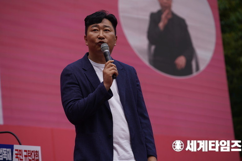개그맨 '최국'이 28일 오후 서울 시청역에서 열린 사법파괴 입법독재 국민 규탄대회에서 규탄사를 하고 있다.