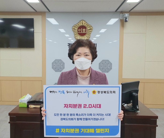 [경북=세계타임즈 한성국 기자] 경상북도의회 남영숙 의원은 2월 17일 '자치분권 2.0'시대의 시작을 응원하는 '자치분권 기대해' 챌린지에 동참했다.