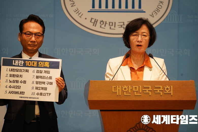 더불어민주당 '추미애', '박선원' 의원이 2일 서울 여의도 국회 소통관에서 내란특검 관련 기자회견을 하고 있다.