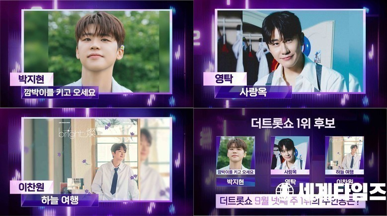 1위 후보곡은 꾸준히 많은 이들에게 사랑을 받고 있는 이찬원의 ‘하늘 여행’과 발매 후 뜨거운 반응을 한몸에 받으며 1위 후보로 오른 영탁의 ‘사랑옥’, 새로운 곡으로 다시 한번 영광의 1위를 노리는 박지현의 ‘깜빡이를 키고 오세요’가 선정됐다.