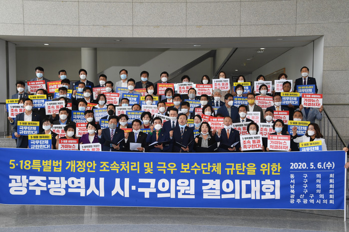 광주시의회와 5개 자치구 소속의원 90여명은 6일 오전 광주시청 1층 시민홀에서 시‧자치구의회 합동 결의대회를 개최하여 극우보수단체의 금남로 집회 추진을 규탄하고 5‧18을 왜곡‧날조하는 행위를 금지하는 5‧18특별법의 조속한 처리를 촉구하는 성명을 발표했다.