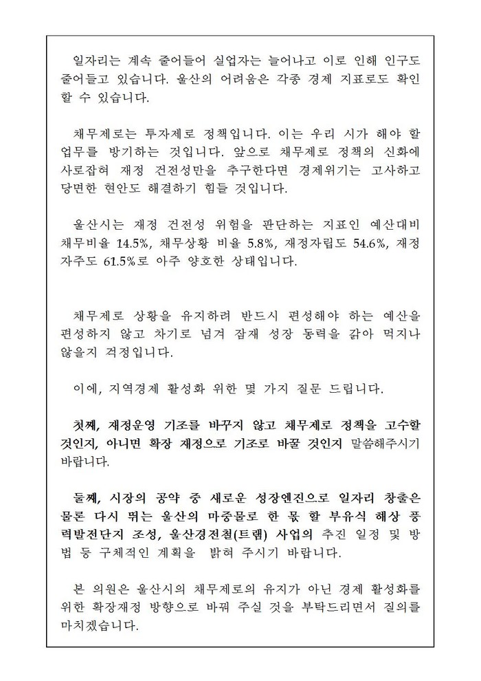 그는 지역경제 활성화 위한 재정방향을 바꿀 것을 주장하면서 서면질문을 통해, “재정운영 기조를 바꾸지 않고 채무제로 정책을 고수할 것인지? 아니면 확장 재정으로 기조로 바꿀 것인지? 그리고 시장의 공약 중 새로운 성장엔진으로 일자리 창출은 물론 다시 뛰는 울산의 마중물로 한 몫 할 부유식 해상 풍력발전단지 조성, 울산경전철(트램)은 언제 시작하고 어떤 방법으로 추진할 것인지 구체적인 계획을 밝혀”달라고 요구했다.