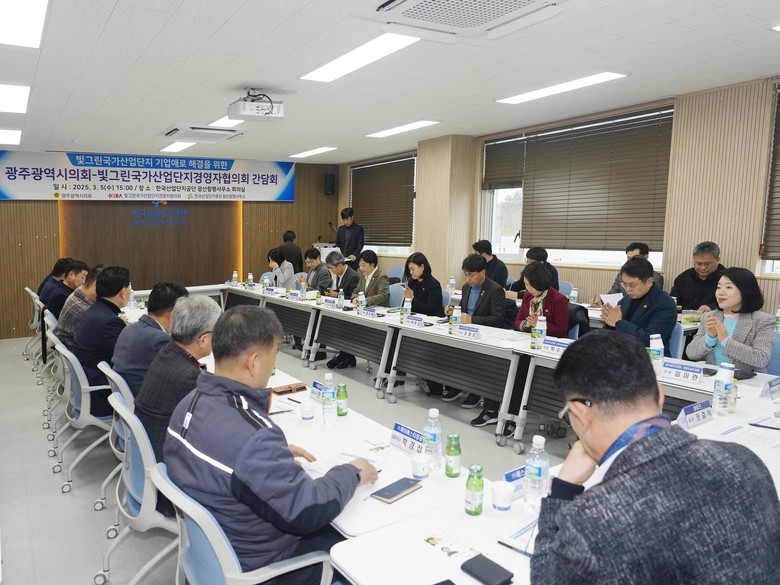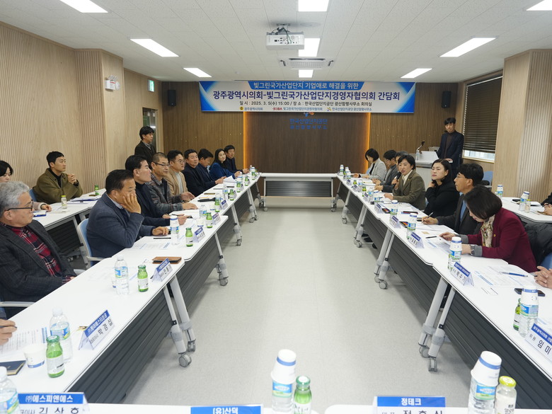 이날 간담회에는 신수정 의장, 박필순 산업건설위원장, 김용임 의원, 박수기 의원, 임미란 의원, 최지현 환경복지위원장, 빛그린국가산단 입주기업협의회 양오열 회장 및 회원, 한국산업단지공단, 광주광역시, 광주경제자유구역청 등 30여명이 참석하였다.