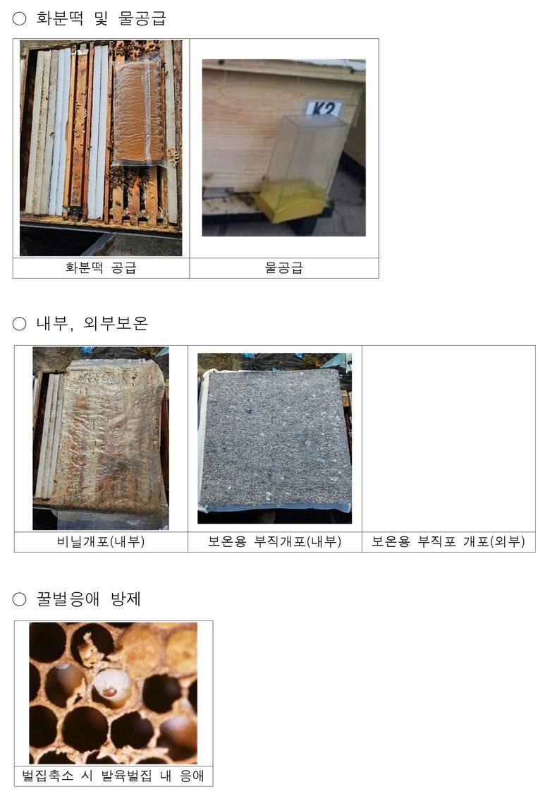 먼저, 가장 중요한 요소인 내부 보온은 꿀벌 유충의 적정 발육 온도가 약 34.5℃인 만큼 보온판을 최대한 활용해 틈새 없이 유지하고, 비닐개포·헝겊개포·보온부직개포 등을 여건에 맞게 병행 사용한다.