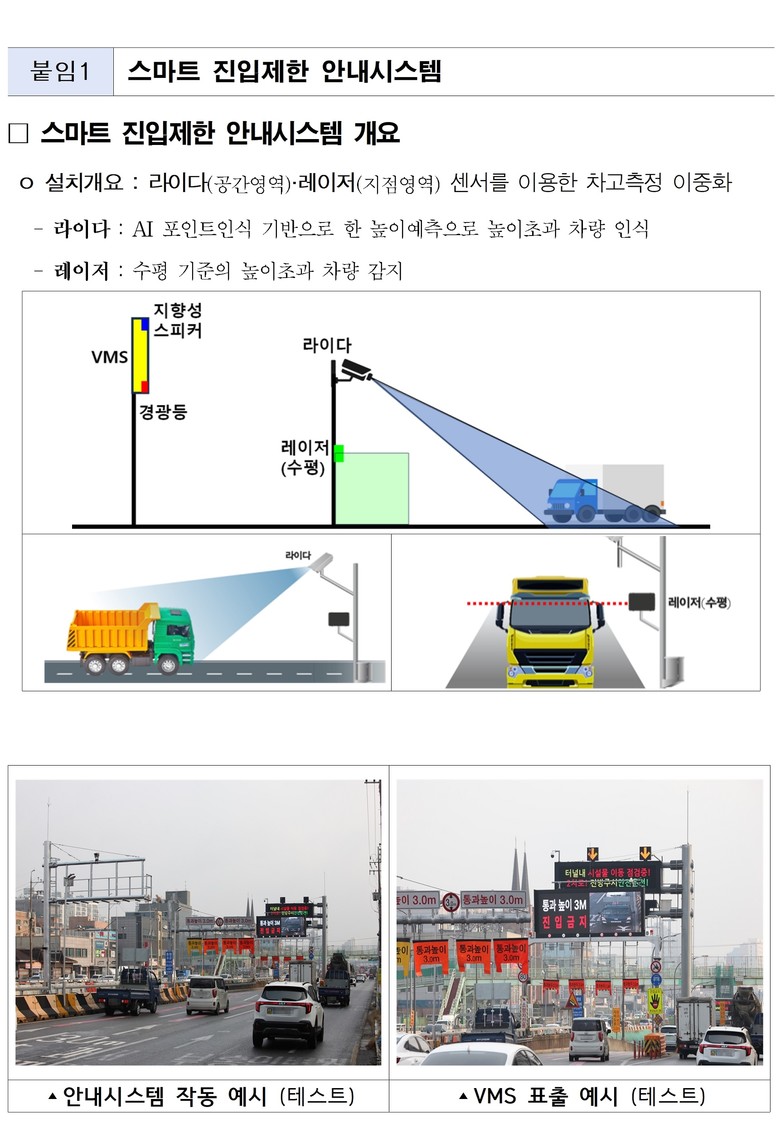 - 높이 초과 차량 AI라이다와 레이저로 이중 감지, 표지판·경광등·지향성스피커로 안내
