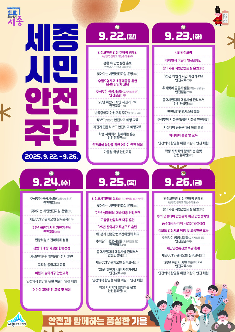 올해 하반기 안전주간은 ‘안전과 함께하는 풍성한 가을’을 주제로, 시민과 공공기관, 교육청, 유관 단체가 함께 참여해 생활 속 안전문화를 확산할 계획이다.