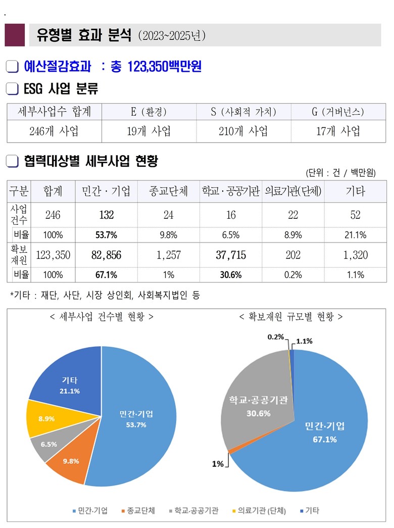이번 분석은 2023년부터 2025년까지 추진한 사업 가운데 직·간접적 예산절감효과가 있는 사업을 대상으로 진행했다. 246개 사업을 환경(E)·사회적 가치(S)·거버넌스(G) 분야로 유형화하고 협력대상과 협력유형에 따라 재정효과를 산출한 결과, 그 효과가 약 1,234억 원으로 집계됐다. 이 결과는 갈수록 늘어나는 행정 수요와 줄어드는 세수라는 지자체의 공통된 난제를 ‘민관 협력’이라는 영리한 해법으로 정면 돌파한 사례로 평가할 수 있다.