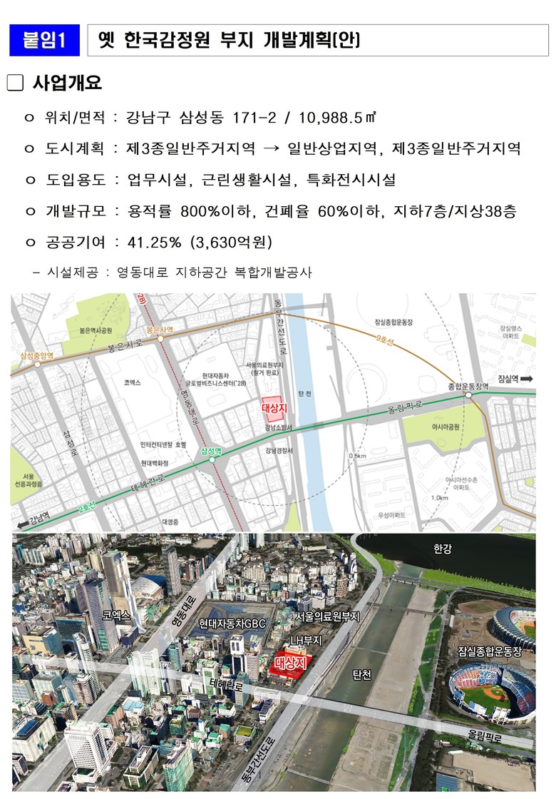 서울시는 12.19.(금)부터 내달 2일(금)까지 민간사업자(삼성생명)와 사전협상으로 합의한 옛 한국감정원 본사 부지(강남구 삼성동 171-2) 주민제안 지구단위계획 변경(안)을 열람공고 한다고 밝혔다.