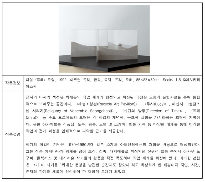 ○ [아카이브] - 마지막 소주제는 최재은의 작업 세계가 형성되고 확장된 과정을 모형과 문헌 아카이브를 통해 통합적으로 조망한다.〈재생조형관(Recycle Art Pavilion)〉,〈루시(Lucy)〉, 해인사〈성철스님 사리기(Reliquary of Venerable Seongcheol)〉,〈시간의 방향(Direction of Time)〉, 다실〈즈레(Zure)〉등 주요 프로젝트의 모형은 각 작업의 개념적·구조적 실험을 가시화하며, 작품집과 도록, 평론, 도면, 스케치, 언론 기록 등 문헌 자료는 작가의 작업 전개 과정을 입체적으로 보여준다.