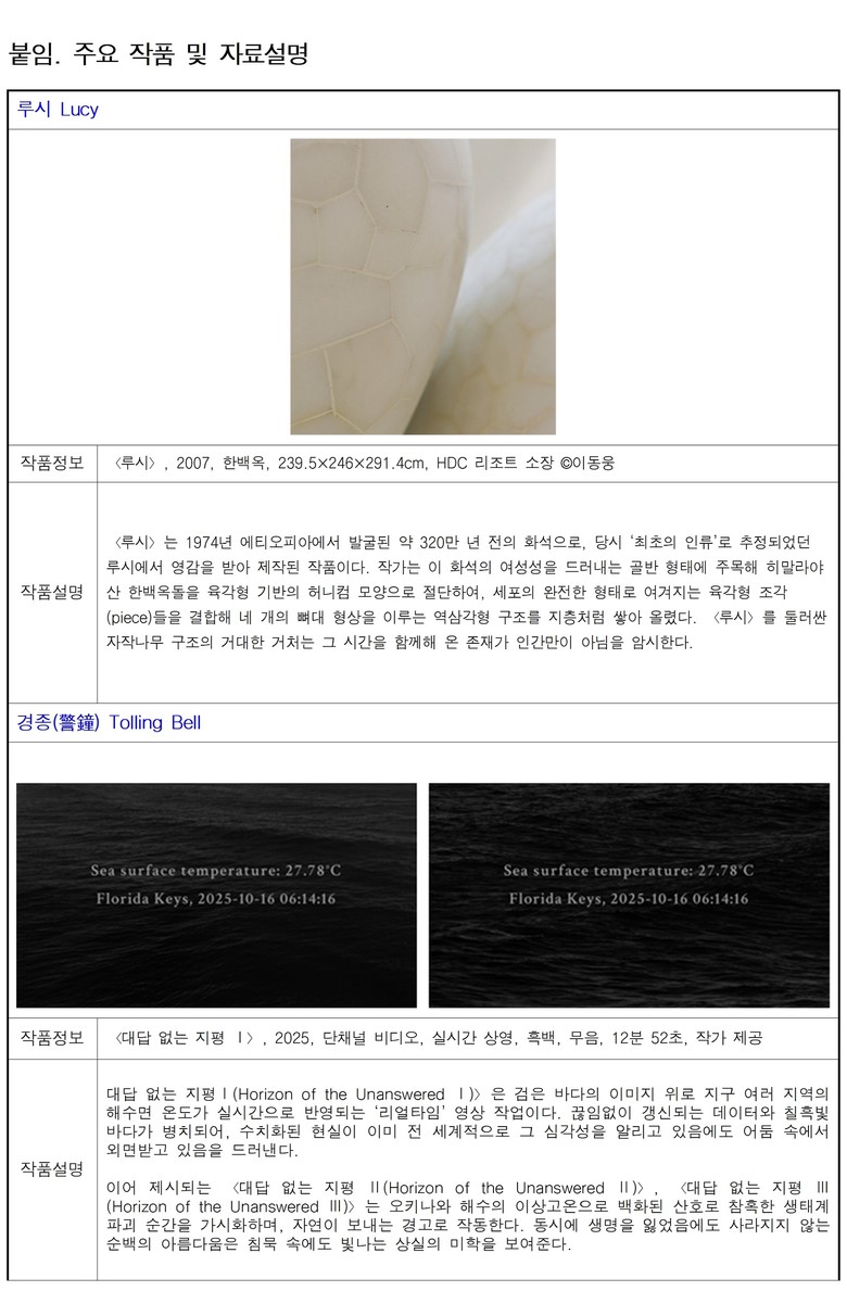 ○ [경종(警鐘)] -‘경종’에서는 실시간 해수면 온도 데이터와 바다 이미지를 결합한 영상 작업 〈대답 없는 지평(Horizon of the Unanswered)〉 연작을 통해 기후 위기와 생태 파괴의 현실을 가시화한다. 백화된 산호의 이미지는 자연이 보내는 경고로 작동하며, 인간중심적 시각을 넘어 바다와 대지가 울리는 경종에 귀 기울일 것을 제안한다.