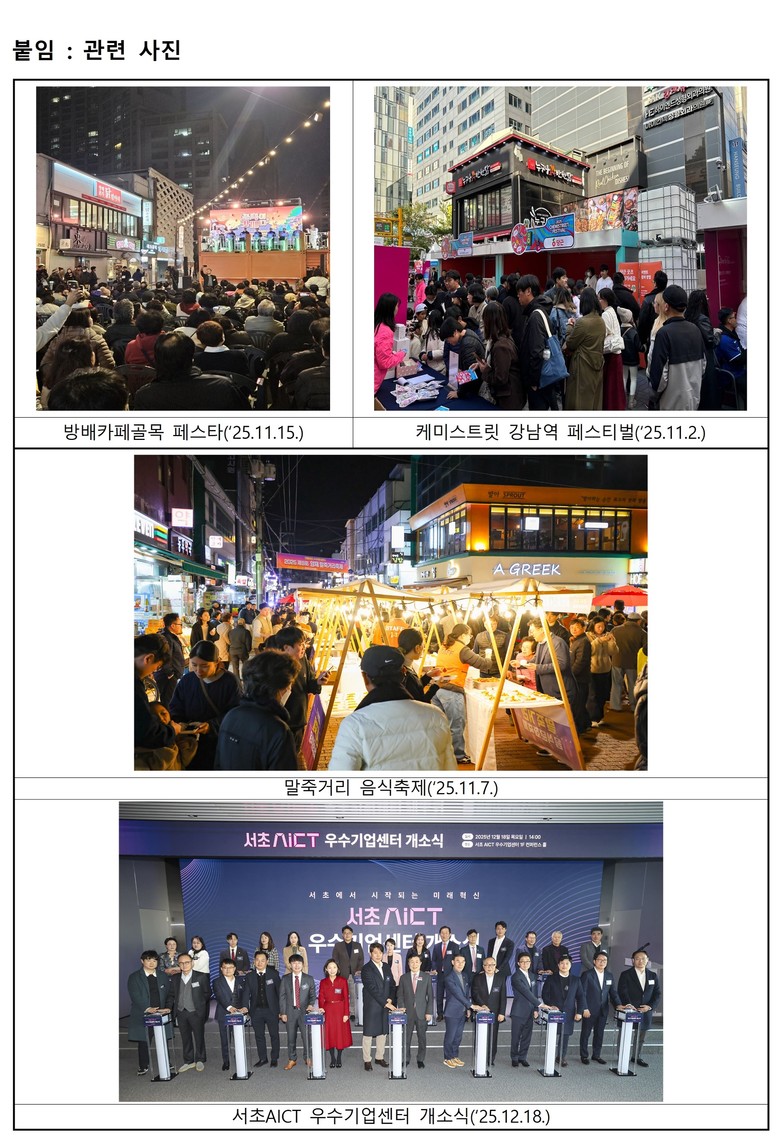 이와 함께 12개 주요 상권 골목형상점가 지정 추진에도 힘을 쏟는다. 2022년 말죽거리, 2023년 서초쇼핑에 이어 지난해 제3호 골목형상점가로 ‘반드레길’과 제4호 ‘잠원하길’, 제5호 ‘방배역먹자골목’, 제6호 ‘강남역 인근’을 추가 지정했는데, 올해는 나머지 골목형상점가를 지정 완료하며 지역경제와 골목상권 활성화의 기반을 확고히 다지는 계기를 마련할 계획이다.