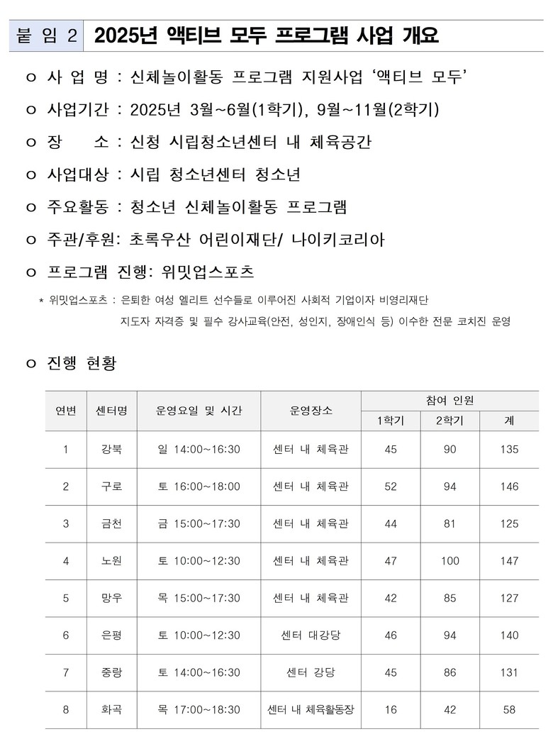 서울시는 초록우산 어린이재단과 나이키코리아의 인력 및 장비 지원을 바탕으로 신체 놀이활동 프로그램 ‘액티브 모두’를 운영하며, 공간 조성과 연계한 프로그램 운영 체계를 함께 구축했다. 지난해에는 8개 시립청소년센터(강북, 구로, 금천, 노원, 망우, 은평, 중랑, 화곡)에서 총 1,009명의 아동·청소년이 참여해 놀이 중심 활동과 여학생 특화 구기종목 프로그램 등을 운영했다.