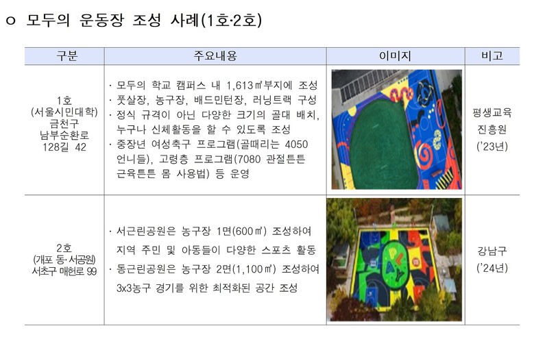 이번 강북청소년센터 모두의 운동장은 금천구 ‘모두의학교’*(1호, ’23년), 강남구 ‘개포동·서근린공원’**(2호, ’24년)에 이은 세 번째 사례다.