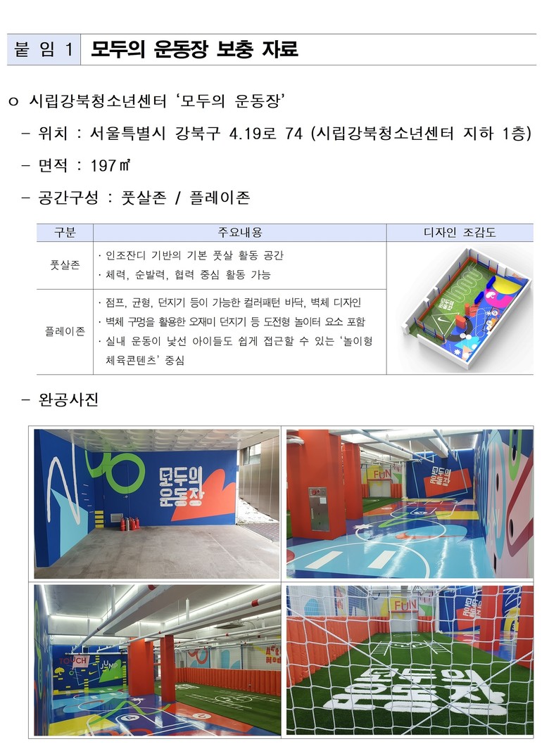 서울시는 지난해 7월 공개 공모를 통해 모두의 운동장 조성 대상지를 모집한 뒤 서류 심사와 현장 실사를 거쳐 시립강북청소년센터를 최종 선정했으며, 이후 청소년 참여 디자인 워크숍을 포함한 공간 설계 과정을 거쳐 지난해 말 공사를 완료했다.