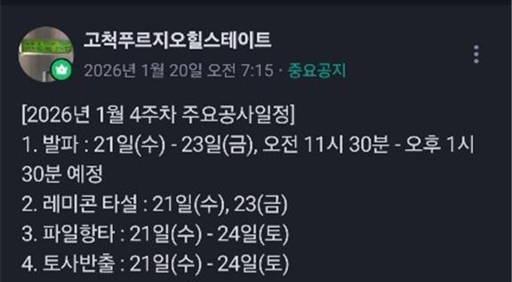 | ▲ 고척4주택재개발정비사업 공사 현장 큐알(QR)코드로 제공되는 주간 주요 공사 일정 안내 화면. 발파·타설 등 요일별 작업 내용이 공개돼 주민들이 공사 진행 상황을 쉽게 확인할 수 있다. |