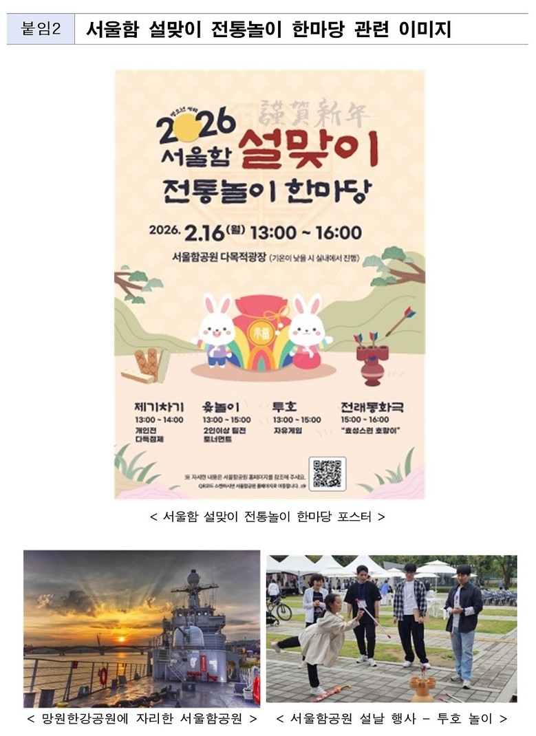 <2.16.(월) 하루 ‘서울함공원’ 제기차기, 투호놀이, 윷놀이 팀전, 구연동화 등 다채>