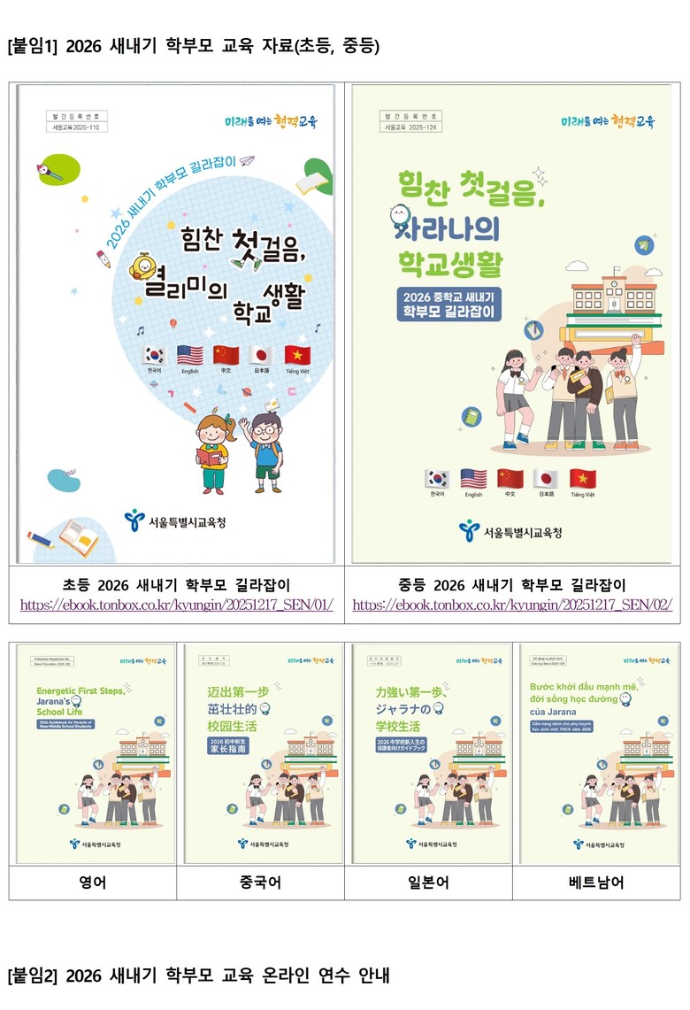 이번 길라잡이는 영어·중국어·일본어·베트남어 등 4개 언어로 번역해 전자책으로 제공함으로써, 다양한 배경의 학부모가 보다 쉽게 활용할 수 있도록 했다. 아울러 디지털 환경에서 빠르게 정보를 접하는 자녀의 특성을 고려해, 입학 전 준비 사항부터 학교생활 전반에 대한 이해, 안전한 학교생활을 위한 안내, 학부모가 알아두면 도움이 되는 주요 교육 정보를 담아 구성했다.