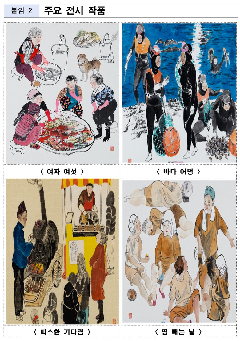 ‘가는 정 오는 정’, ‘땀 빼는 날’, ‘여자 여섯’ 등의 작품은 시장, 마을, 찜질방 등 우리 일상의 공간과 그 안에 존재하는 소박한 사람들의 모습이 오롯이 담겨 있다. 작가는 먹과 옅은 채색을 통해 우리, 공간과 삶을 고요하고 담담하게 그린다.
