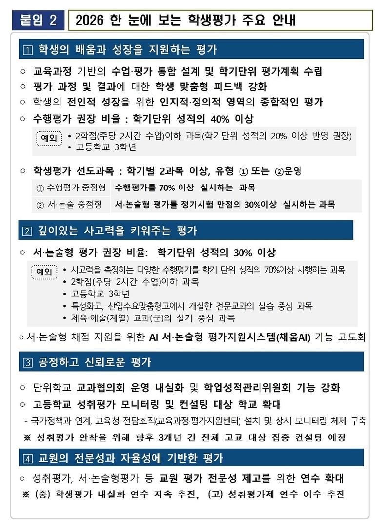 이번 계획은 서‧논술형 평가 확대와 AI 채점 지원 도입, 평가 공정성 강화 등을 통해 학교 현장의 평가 부담을 줄이면서도 신뢰도를 높이는 데 초점을 두고 있다.