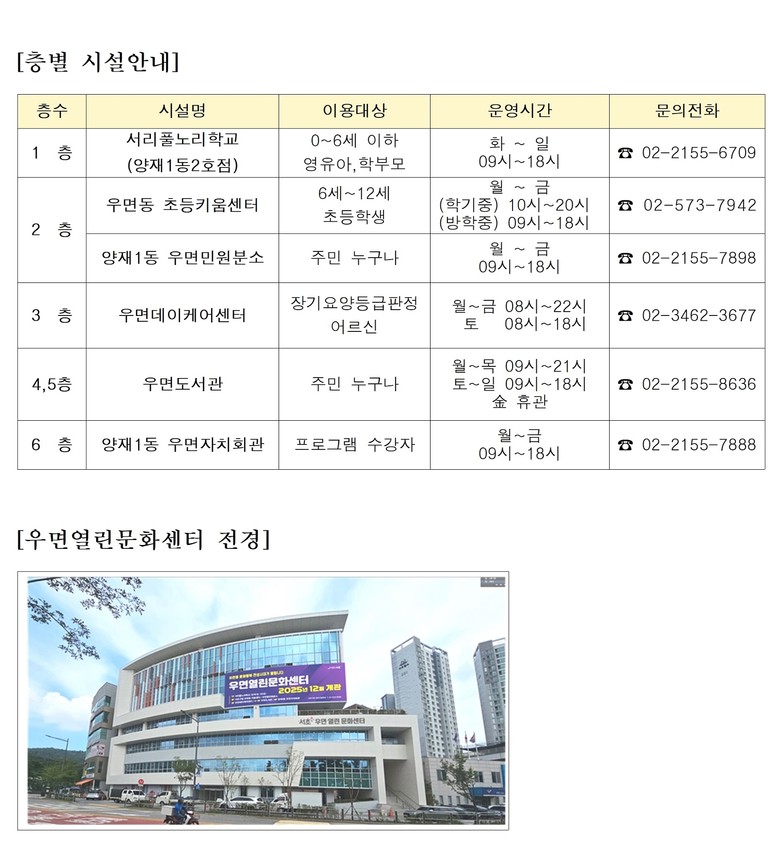 - 센터 내 서리풀노리학교, 초등키움센터, 우면민원분소, 우면데이케어센터, 우면도서관, 우면자치회관 등 총 6개 시설 마련