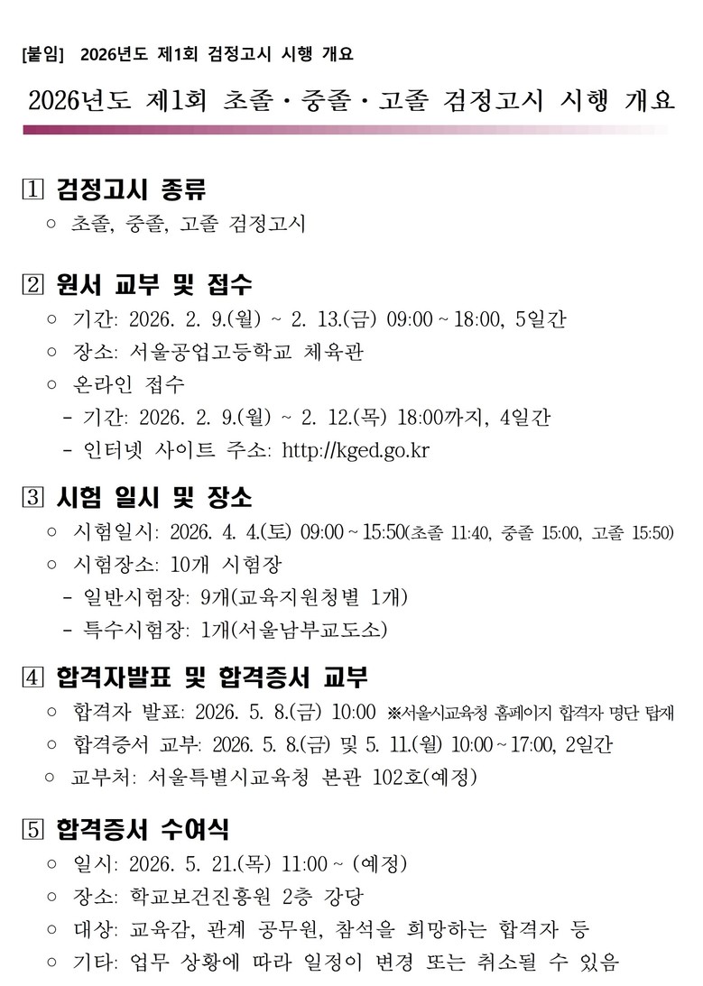 2026년 제1회 검정고시는 오는 4월 4일(토)에 시행하며, 합격 여부는 5월 8일(금)에 서울시교육청 누리집(www.sen.go.kr)을 통해서 확인할 수 있다.