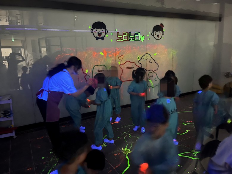 3세 유아들은 색자갈을 활용한 ‘칼라스톤’ 놀이에 참여했다. 아이들은 알록달록한 색감을 탐색하고 자갈의 다양한 촉감을 느껴보며, 자갈을 병에 담아 흔들어보는 즉석 악기 놀이를 통해 소리를 만드는 재미도 경험했다. 이어진 야광 물감 놀이와 다육이 화분 심기 활동은 유아들의 감각과 정서를 자극하며 높은 몰입을 이끌어냈다.