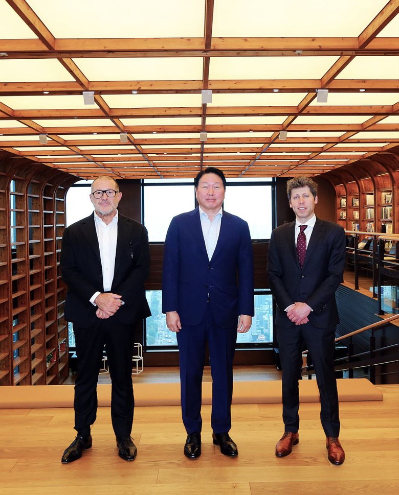 ▲최태원 SK 그룹 회장(가운데)과 샘 올트먼 OpenAI CEO(오른쪽), 조나단 아이브 OpenAI 크리에이티브 헤드 (Creative Head) (왼쪽)가 1일 서울 종로구 SK서린빌딩에서 기념 촬영을 하고 있다.(사진=SK하이닉스)