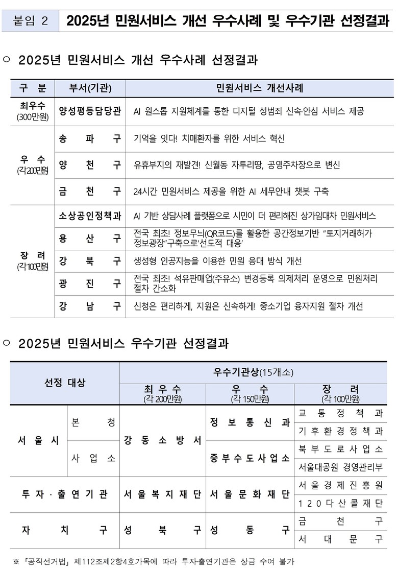 이와 함께 올해 우수한 민원 처리로 시민만족도 향상에 기여한 민원서비스 우수기관 15개소도 발표했다. 연간 총 160만여 건에 달하는 민원의 처리기한 준수율 등 평가 점수와, 미스터리 쇼퍼를 활용한 전화‧방문 민원 응대 점수 등을 합산해 선정됐다.