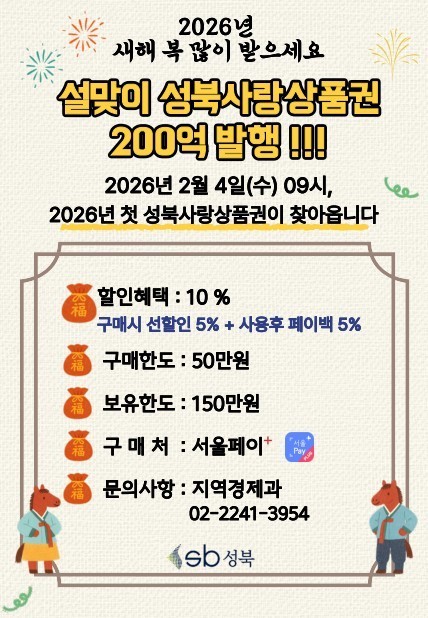 - 서울페이플러스 통한 구매 방식과 관내 가맹점 사용 안내 [성북구 세계타임즈=이장성 기자] 서울 성북구(구청장 이승로)가 설 명절을 앞두고 구민의 장바구니 부담을 완화하고 골목상권 활성화를 위해 오는 2월 4일 오전 9시부터 200억 원 규모의 ‘성북사랑상품권’을 발행한다.
