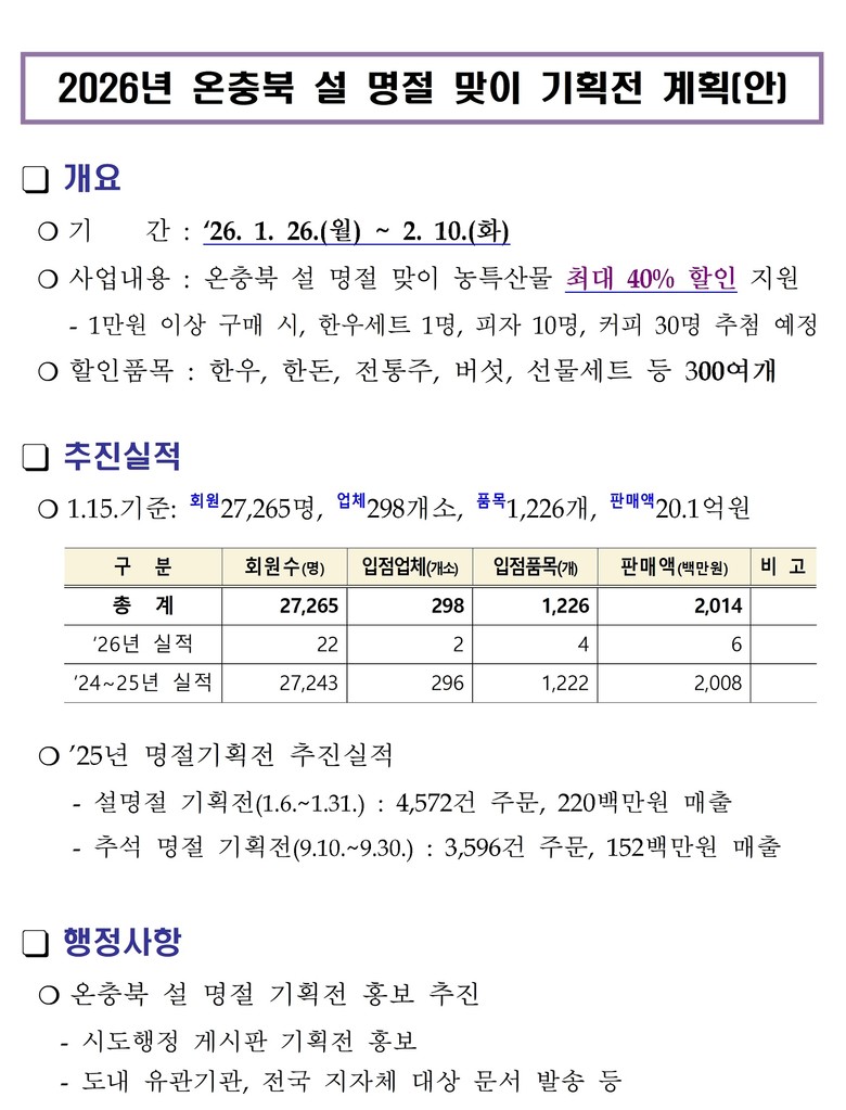 이번 기획전에서는 충북 지역의 우수 농특산물을 대상으로 최대 40%의 할인 혜택을 적용해 설 명절을 앞두고 합리적인 소비 기회를 제공할 예정이다.