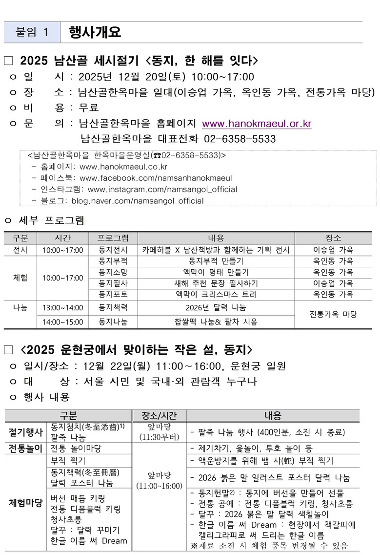- 남산골한옥마을 , 동지부적‧액막이 명태 만들기, 찹쌀떡 나눔 및 2026년 달력 배부