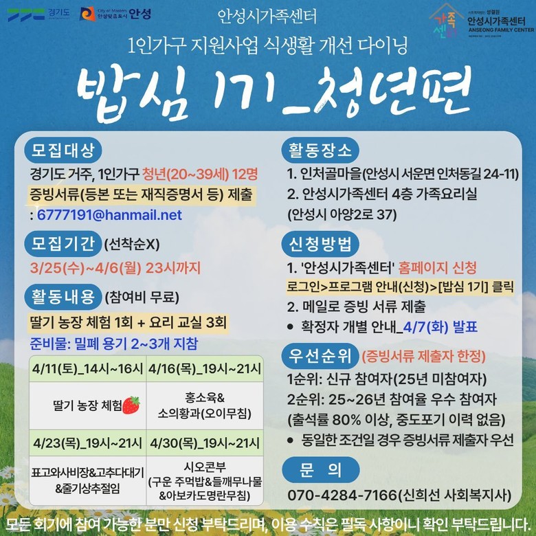 참가비는 전액 무료이며, 참여를 희망하는 20~39세 청년 1인가구는 안성시가족센터 홈페이지를 통해 신청 후 증빙서류를 메일(6777191@hanmail.net)로 제출하면 된다. 최종 선정자는 4월 7일 개별 안내될 예정이다.