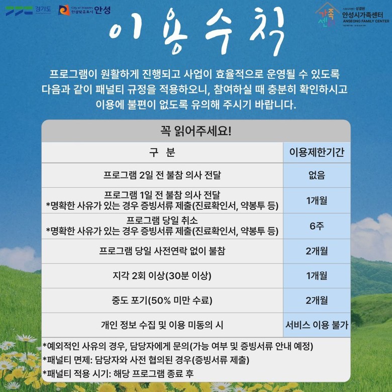 자세한 사항은 안성시가족센터 홈페이지를 확인하거나 전화(070-4284-7166)로 문의하면 된다.