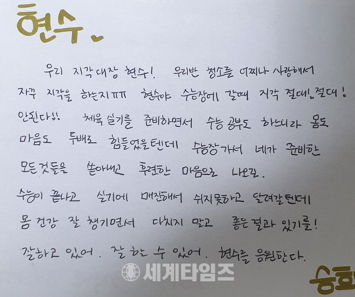 학년초 학생들과 찍은 사진 뒷면에 응원의 손 편지와 따뜻한 핫팩, 그리고 약간의 간식을 개별 포장하여 진정한 사랑으로 학생들을 응원하여 주셨다고, 선생님이 너무 고맙고 학부모로서 많은 위안이 되었다고 말을 이었다.