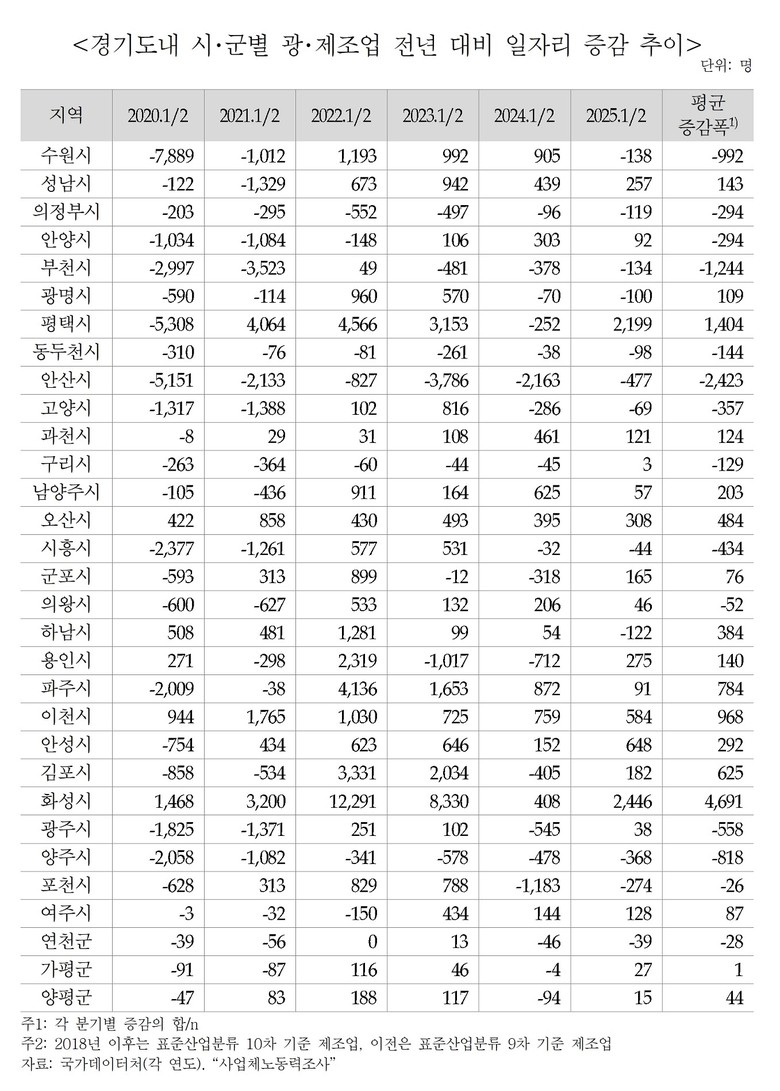 고용노동부 사업체노동력조사 자료를 활용해 2020년 이후 경기도 제조업 일자리 전년 대비 증감 추이를 시군별로 분석한 결과, 2022년 화성시(12,291명)와 평택시(4,566명) 등 자동차와 반도체 중심의 수출 주력산업 지역에서 일자리가 크게 늘었다. 반면 전통 제조업 중심의 일자리가 많은 대표 지역인 안산시는 2020년(-5,151명)부터 2025년(-477명)에 이르기까지 일자리 감소가 이어졌다. 즉, 화성시, 평택시, 이천시 등 첨단 제조업 중심 지역은 고용이 증가한 반면, 안산시, 부천시, 양주시 등 전통 제조업 비중이 높은 지역은 2020년 이후 전반적으로 일자리가 감소하는 양상이다.
