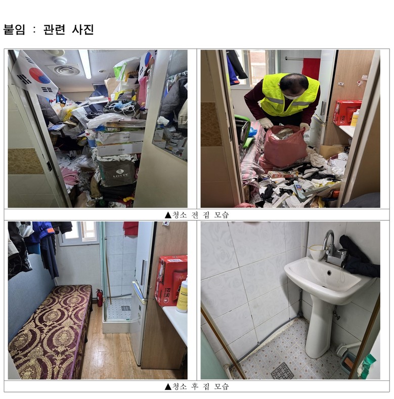 정비가 완료된 뒤 어르신은 “예전에는 물건이 너무 많아 눕지도 못하고 앉아서 자다보니 다리가 아팠다. 이제는 침대에 누워 다리를 뻗고 잘 수 있어 꿈만 같다”라며 “혼자서는 엄두도 못 냈는데 주민센터에서 먼저 찾아와 도와줘 다시 사람답게 사는 느낌이 든다”라고 감사의 뜻을 전했다.