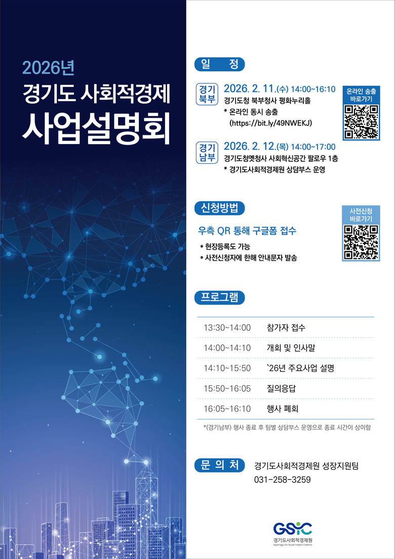 - 10일까지 현장 참석자 사전 모집 [경기도 세계타임즈=송민수 기자] 경기도사회적경제원은 오는 11일과 12일 양일간 경기 북부와 남부에서 ‘2026년 경기도 사회적경제 사업설명회’를 연다.