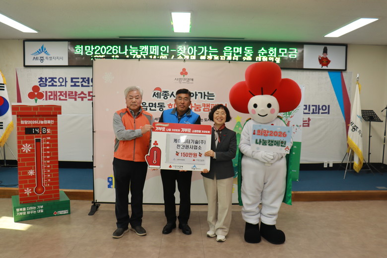 [세종 세계타임즈=이채봉 기자] 세종특별자치시 소정면(면장 김광태)이 지난 4일 열린 ‘2026년 희망나눔 캠페인 찾아가는 읍면동 순회모금’ 행사에서 케이워터기술㈜천안권사업소가 150만 원을 기부했다고 밝혔다.