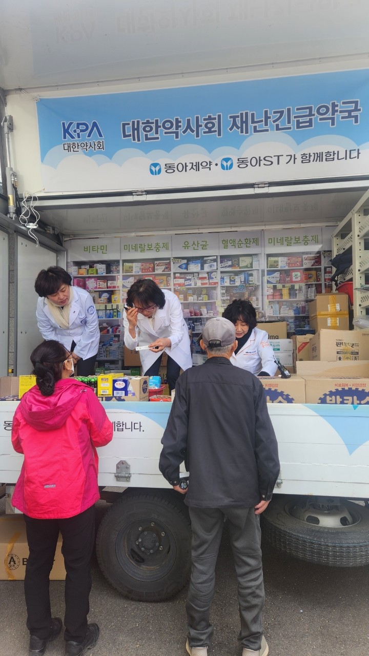 대한약사회와 경북약사회는 산불 피해를 입은 주민을 위해 피해지역을 순회, 봉사약국 차량을 이용해 두통과 불안감 등을 호소하는 이재민에게 복약지도 및 의약품을 지급하며 위로했다.